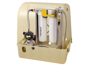 Offering system flows of 50 up to 70 lpm the Microlene Aquashield MAX offers the convenience of water pressure, filtration and disinfection in a neat and tidy package. All models come preassembled in their own weatherproof enclosure.